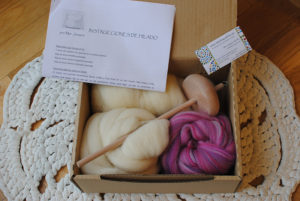 It arrived yesterday and I couldn’t wait to open it. It contains three kinds of fiber: wool, merino and dyed merino; a drop spindle made by Ashford; and written instructions on how to do it, including a link to Youtube:
