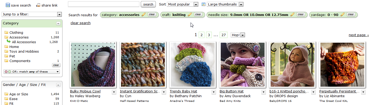 Oh, yes, Ravelry filters are so useful!! I use them all the time to find patterns or projects. Very recently I found a quick and perfect project for the yarn I had in my stash, that was also very close to the idea I had in mind: I wanted mitts with cables, in worsted weight yarn, and a free pattern, and I then found these cute mitts that were perfect for the present I wanted to make: