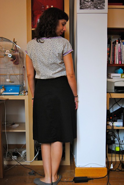I added a black rayon lining where I used for the first time my brand new pinking shears. Oh, I love this finishing for thin linings, since the faux-overlocker of my sewing machine is a bit overkill for this. I probably should have widened the original waistband but it’s not that bad. I think it’s a classy skirt, and black goes with everything.