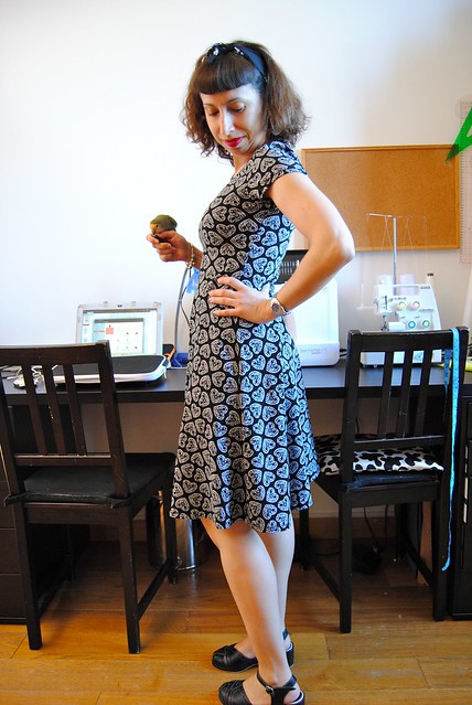 During Me Made May, making the effort of wearing many different garments will teach you why you never wear some of them. But if you’re lazy like me, you’ll recognize a pattern and may even find your uniform. We are just over two thirds of the month, and I’m almost embarrassed when I realize that most of the time I’m either wearing either my Angela Wolf Bootcut Jeans or one of my Lady Skater Dresses. Going for one or the other it really depends on the weather. I’m just like that: practical, basic, boring. As we are having an unusual hot May (we almost reached 40ยบC – 100ยบF -) I’m heavily rotating my Lady Skaters. I thought of wearing once my Cambie Dress, but since I just go out to the grocery store (I work from home), I felt like I was going to be overdressed. I wore one my the Lady Skaters instead. Why? Because they are so easy and comfy to wear, almost like pajamas. But they are also very flattering, and the A-line skirt is ideal for pear shaped gals. Being made with knit fabric means that they won’t wrinkle, no ironing, and you can fold them to a very small size. And they are so easy to make. No interfacing, darts or zipper. Little pressing. It’s really a win win (no, Amanda hasn’t contacted me to write a post about the Lady Skater Dress).