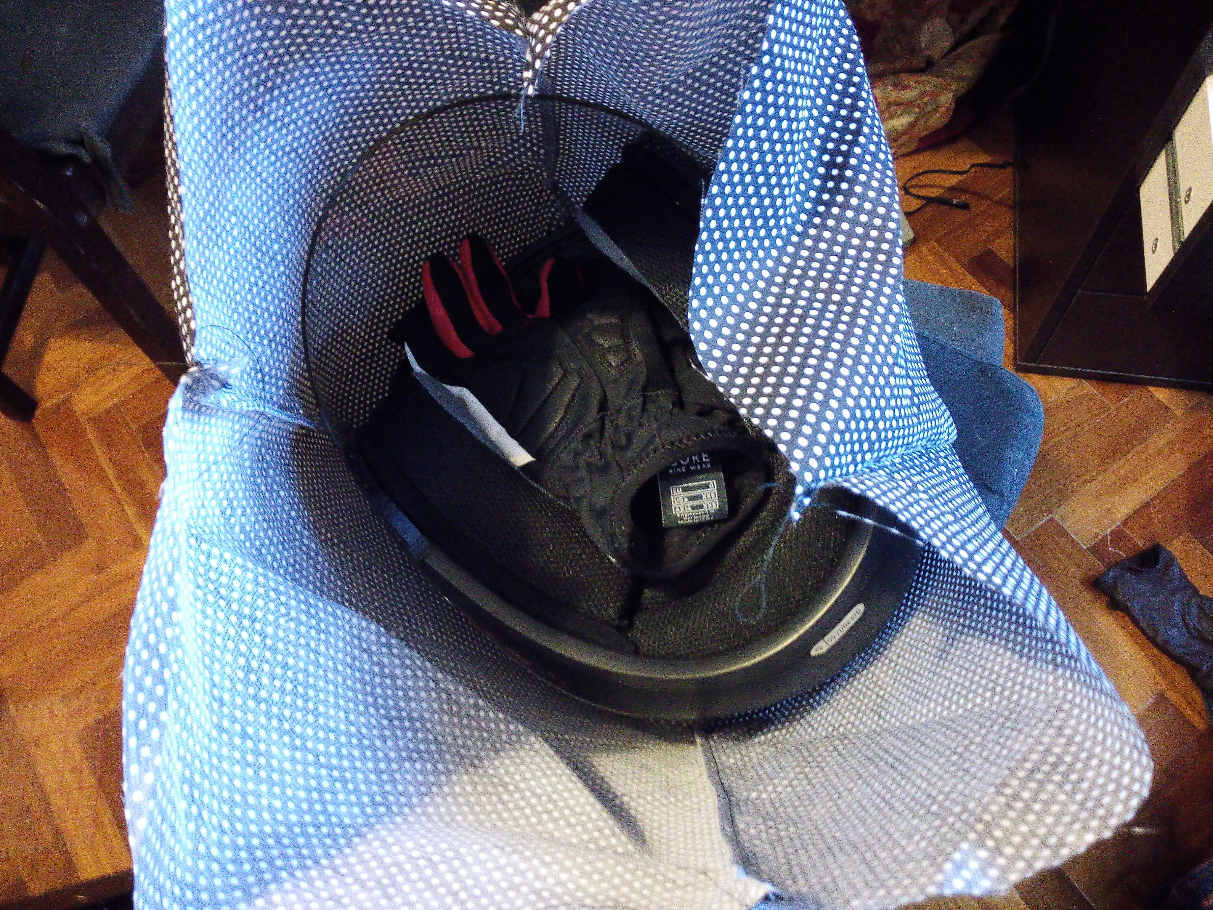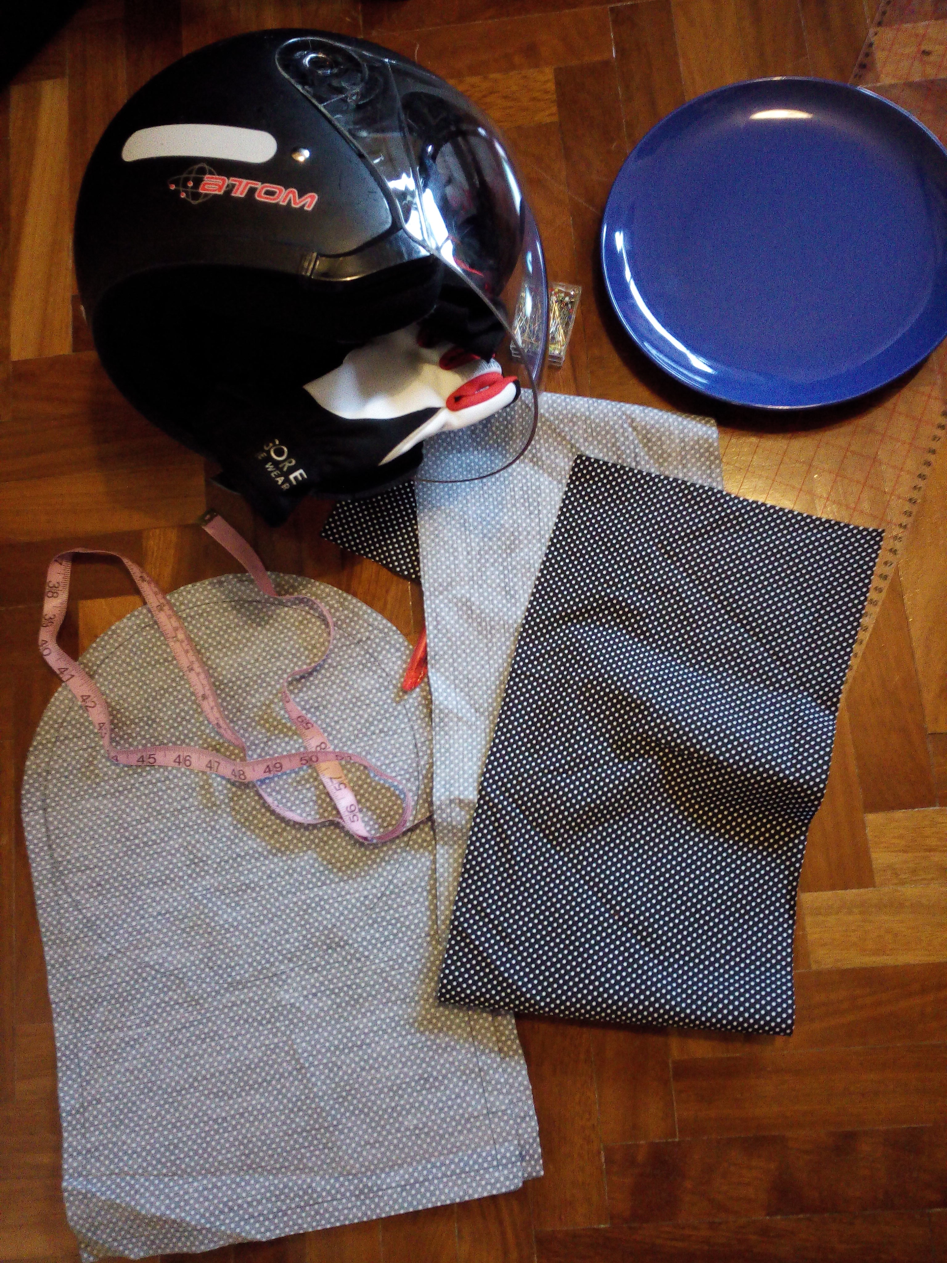 The fabric is some left overs from a dress I made almost three years ago. It’s a quite stiff cotton or cotton blend that will be enough to hold my helmet’s weight.