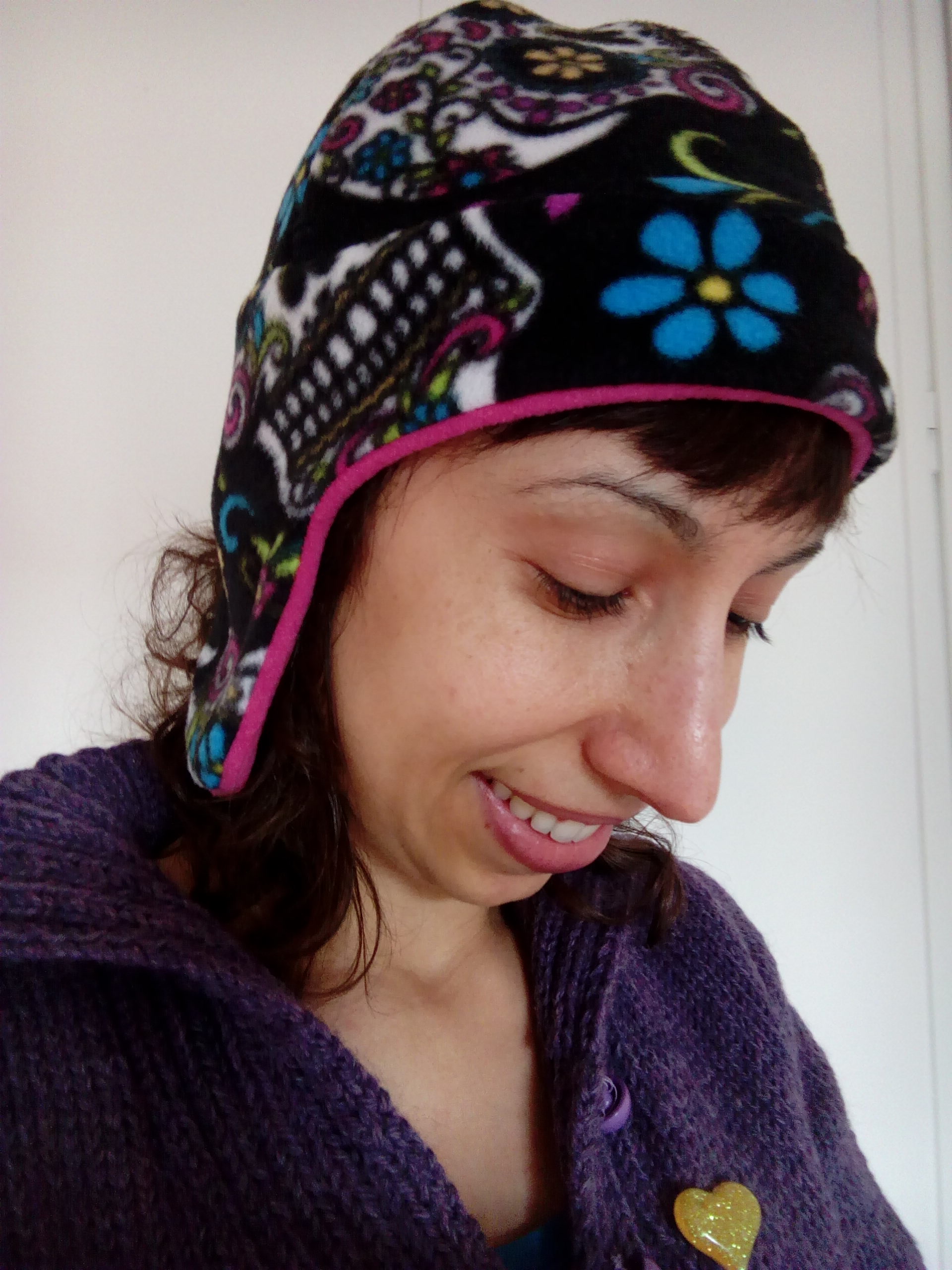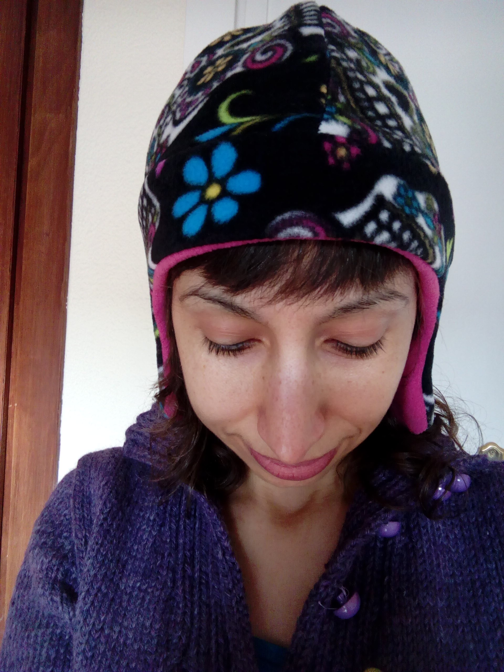 The first stashbusting project was my helmet bag, and here I present you a very quick fleece hat. I just had two knitted hats, and I lost one of them at the beginning of December. The other I don’t like it so much because it’s a bit itchy. I have atopic skin so I’m very picky about yarns for hats. Because of that and how busy we were with the move, I couldn’t knit a new hat, even though I really needed one, since January was so cold that I used to get headaches just by walking five minutes outisde.