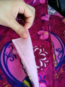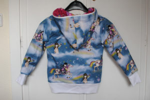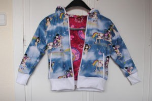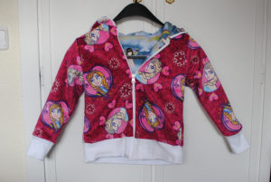 This time I chose a Gorjuss fabric from Con Idea De for the outer shell and a Frozen fabric from Telas.es for the lining. I bought both online, and I was disappointed to find the Frozen fabric too light weight, so I decided to underline it with a pink fleece that’s been in my stash since I was living Belgium (yay for stashbusting!). I liked the end result, and it helped to give the hoodie extra warmth.