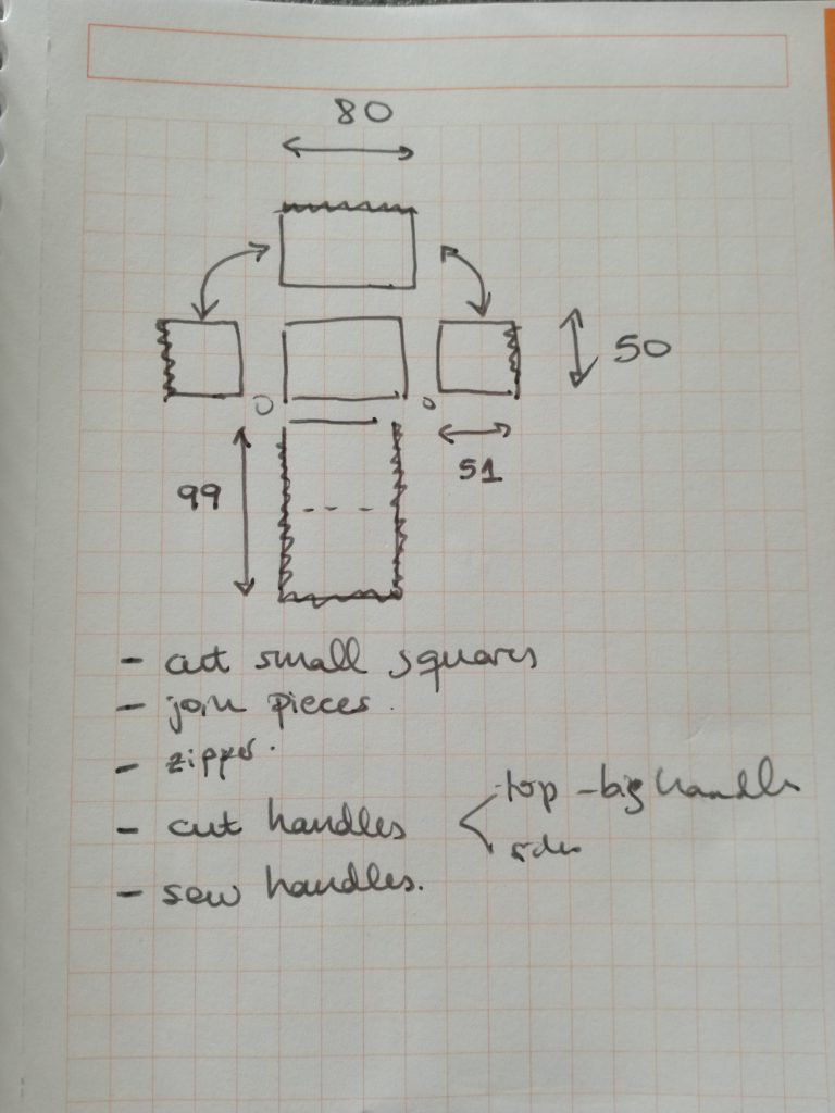 I made a sketch to plan for it. I wanted a bag that could be easily used to cover the cage without too much fuss, and that would allow a ‘window’ for the birds to be able to see me and their surroundings while in the car. I had some beige canvas gifted by my sister some years ago. It is a great fabric to make handbags, I just wasn’t in love with the color, but for this project it was perfect. I attached a handle on each side and a triple handle on top, so that the bag could be easily transported by one or two people. I added a couple of cm to the measurements to have some ease.