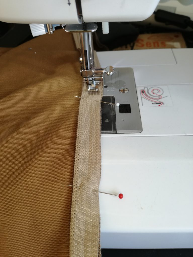 Here you can see it with the ‘window’ in action. At first I wanted to have just one zipper that could be closed inwards, and I actually got one but it was too short (I was stressed out and sleep deprived when I purchased it) and I could not go to the same haberdashery again, so I had to get two zippers, which also works fine. the zippers join in the middle, and run downwards and backwards so when completely open, the bag is almost flat.